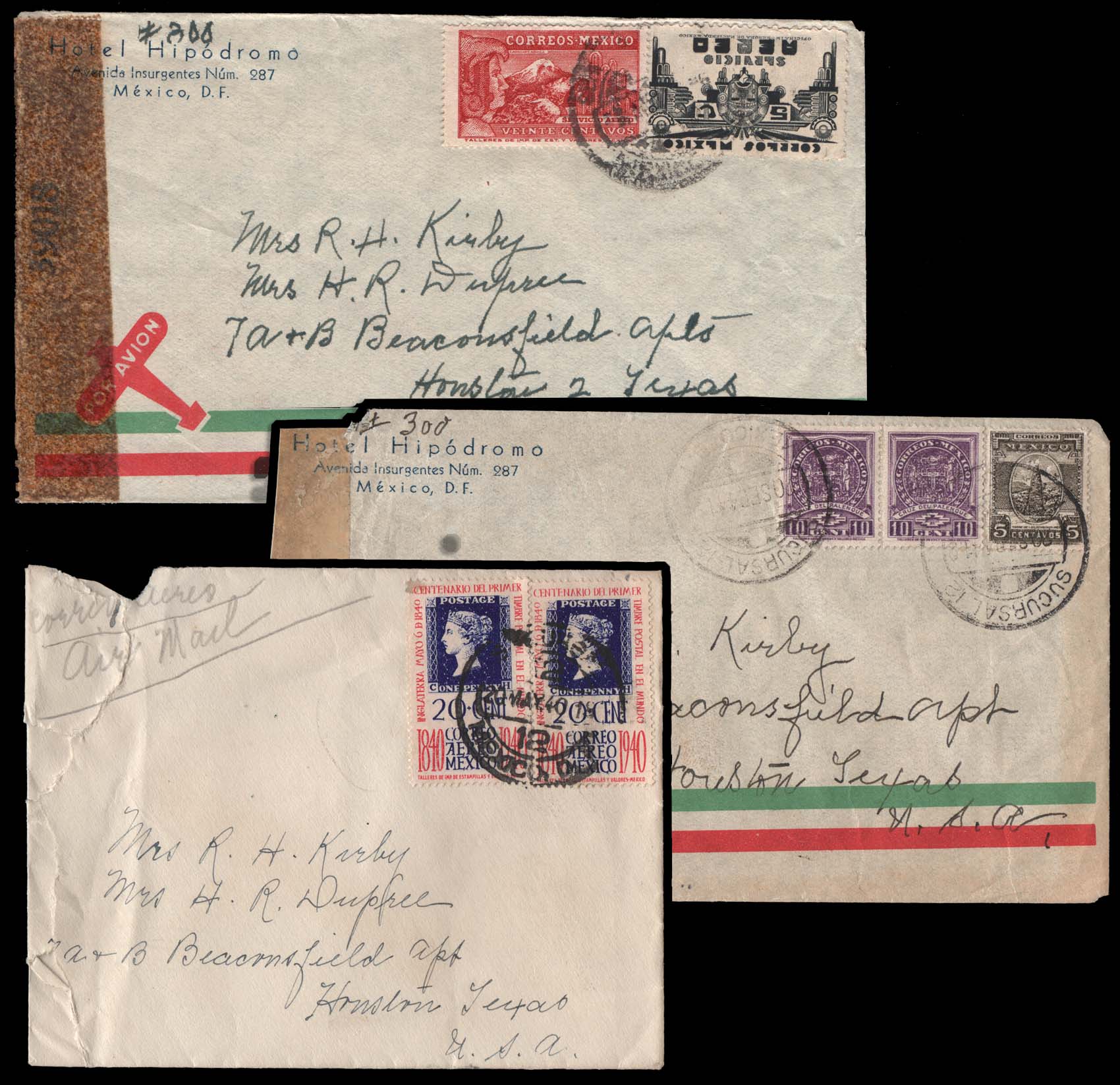 Mexico 732//759, C65//C105,Small accumulation (8) of commercial covers, F-VF, handwritten ink addressed, most are air post and (2) have been censored. All but one roughly opened on one side. Range from 1940 to 1947, mostly '40 and '44 (Image)