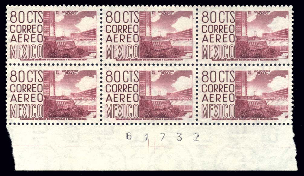 Mexico C220F,80c Claret, Bottom Plate Block of 6 #61732, VF-XF NH, upper left stamp light disturbed gum at left, cv $30 as six singles (Image)