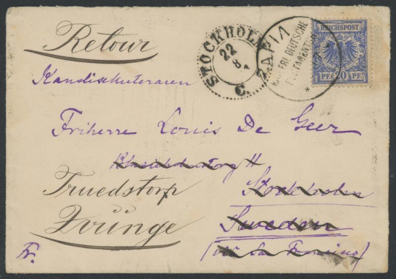 SAMOA: 1891 (July) envelope to Sweden with Germany Large Eagle 20pf blue tied by largely very fine 'APIA/KAISERL. DEUTSCHE/POSTAGENTUR' cds cancel, three different Stockholm transit and arrival markings including '.../K.E./22/8/1891' "thimble" backstamp & '.../C.2' dotted-ring cds on the face where re-directed to Tiringe, a couple of very minor transmission marks. A fine Vorläufer to a scarce destination. (Image1)