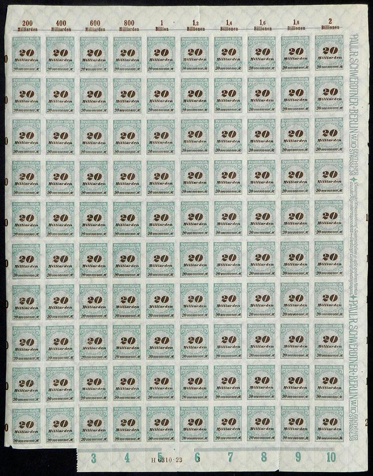 Sc.308, 1923 20,000 millon Marks!!, complete sheet of 100 stamps, MNH, all of excellent quality. One sheet margin is trimmed, very fresh and attractive! (Image)