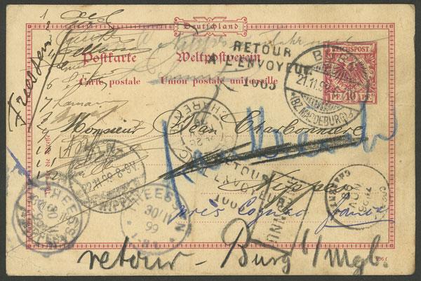 10Pf. Postal card dispatched from BURG (Magdeburg) to France on 21/NO/1899, the addressee could not be found after many attempts in different cities, and the card was eventually returned to sender, very attractive! (Image)