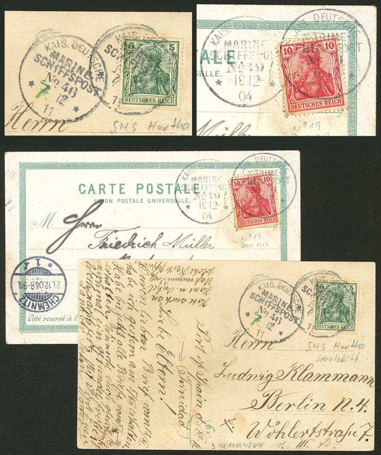 2 Postcards posted at sea in 1904 and 1911 to Germany, franked with 10c and 5c. respectively, with postmarks of ships, VF quality! (Image)