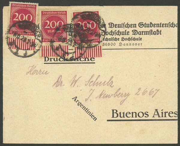 8/SE/1923 Hannover - Argentina, wrapper for printed matter with INFLA postage of 600Mk., very nice! (Image)