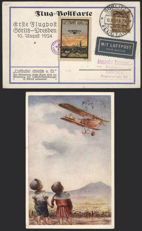 10/AU/1924 Görlitz - Dresden, first flight: card with cinderella and special postmark, VF quality! (Image)