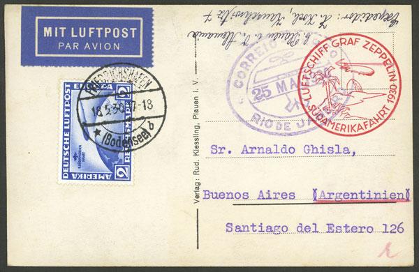18/MAY/1930 Friedrichshafen - Argentina, postcard flown by ZEPPELIN franked with 2Mk. Südamerikafahrt (Sc.C38), with special red handstamp of the flight and violet Rio de Janeiro transit mark (25/MAY), very fine quality! (Image)
