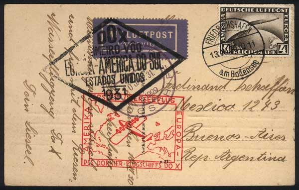 First transatlantic flight of the Dornier DO-X: Card dispatched in Friedrichshafen on 13/NO/1930, flown to Lisbon, and on 30/JA/31 it was flown on the DO-X (Brazil black arrival handstamp) to Buenos Aires, excellent quality, rare! (Image)