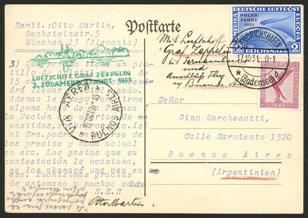 ZEPPELIN FLIGHT: Card sent from Friedrichshafen to Argentina on 17/OC/1931 with nice postage of 2.15Mk. that includes Sc.C41 (US$325 on cover), with Buenos Aires arrival mark, excellent quality! (Image)