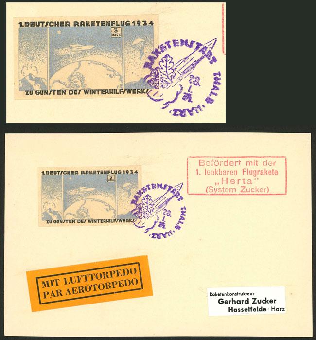 Cover flown by rocket on 28/JA/1934, with nice cinderella of 3Mk., VF quality! (Image)