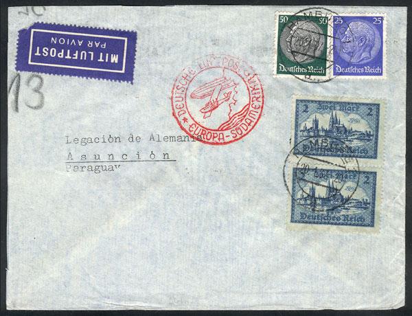 20/JA/1937 Hamburg - PARAGUAY: Airmail cover with good postage of 4.75Mk., with arrival backstamp of Asunción, VF quality! (Image)