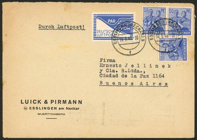Airmail cover sent from Esslingen am Neckar to Argentina on 18/MAY/1948 franked with 150Pg. and a special airmail label perfectly cancelled, excellent quality, Michel catalog value Euros 400. (Image)