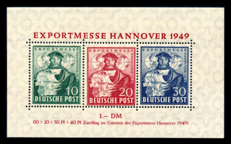 GERMANY 1949 #664a S/S F-VF **. Hanover Export Fair issue, mint never hinged souvenir sheet of 3 stamps signed Schlegel on back. Scott $145.00 CAD. (Image1)