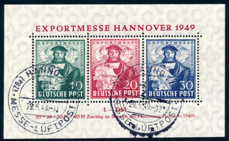 GERMANY 1949 #664a S/S F-VF /O. Hanover Export Fair issue, used souvenir sheet of 3 stamps signed Schlegel on back. 2025 Schlegel certificate. Scott $365.00 CAD. (Image1)