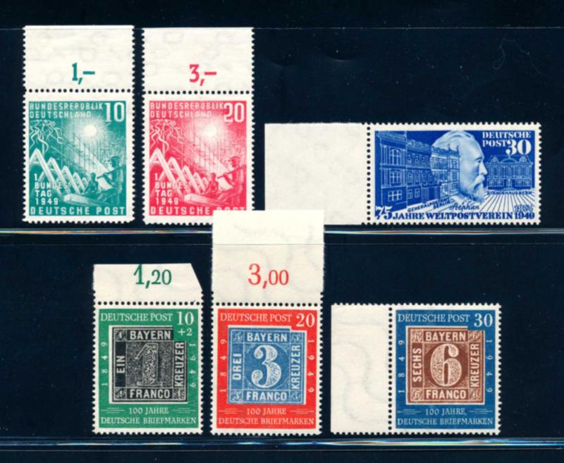 GERMANY 1949 #665-69 + B309 SELECTION STAMPS VF-XF **. Selection of 6 superb stamps mint never hinged with sheet margins. Numbers #665-66 and #669 are signed Schlegel on back. Scott $290.00 CAD. (Image1)