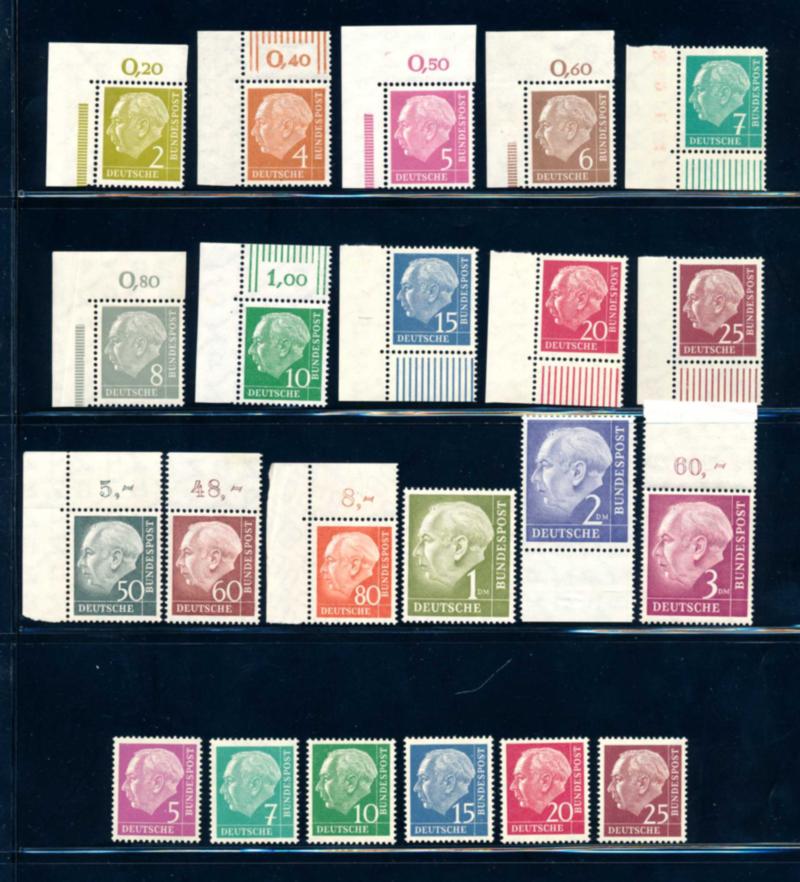 GERMANY 1954-60 #702-21 SET VF-XF **. President Theodor Heuss issue, superb set of 20 stamps mint never hinged with sheet corner margins (except #719 no margin & 720-21 single margin). Also included are numbers #704, 706, 708-11 on fluorescent paper. Scott $330.00 CAD. (Image1)