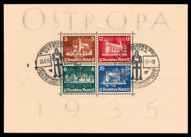 GERMANY 1935 #B68 S/S VF-XF /O. Ostropa issue, superb souvenir sheet canceled by exhibition first day postmark "23.6.35". Very nice show piece. 2023 certificate from German expert Andreas Schlegel. Michel 1100 Euros, Scott $1155.00 CAD. (Image1)