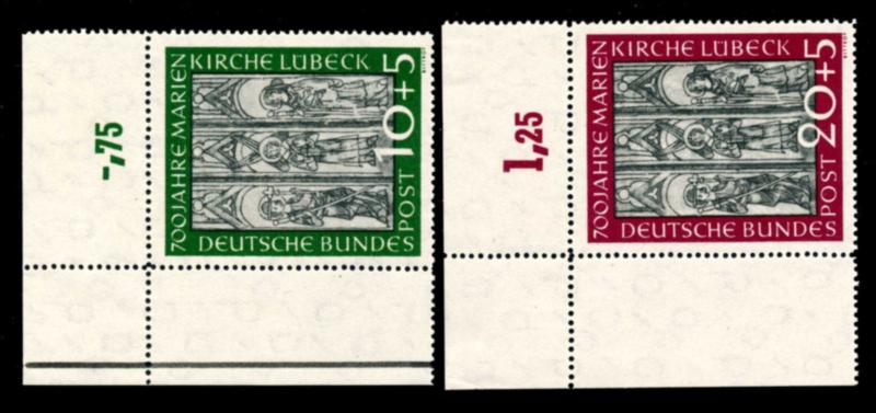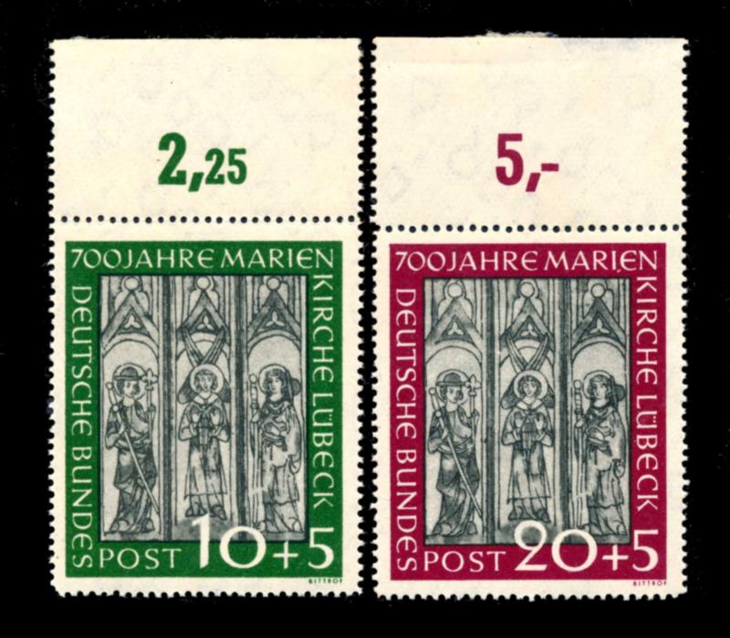 GERMANY 1951 #B316-17 STAMPS XF **. Reconstruction of Marienkirche, superb set of 2 stamps mint never hinged with top numbered corner margins. Light hinge on top margin. Scott $240.00 CAD. (Image1)