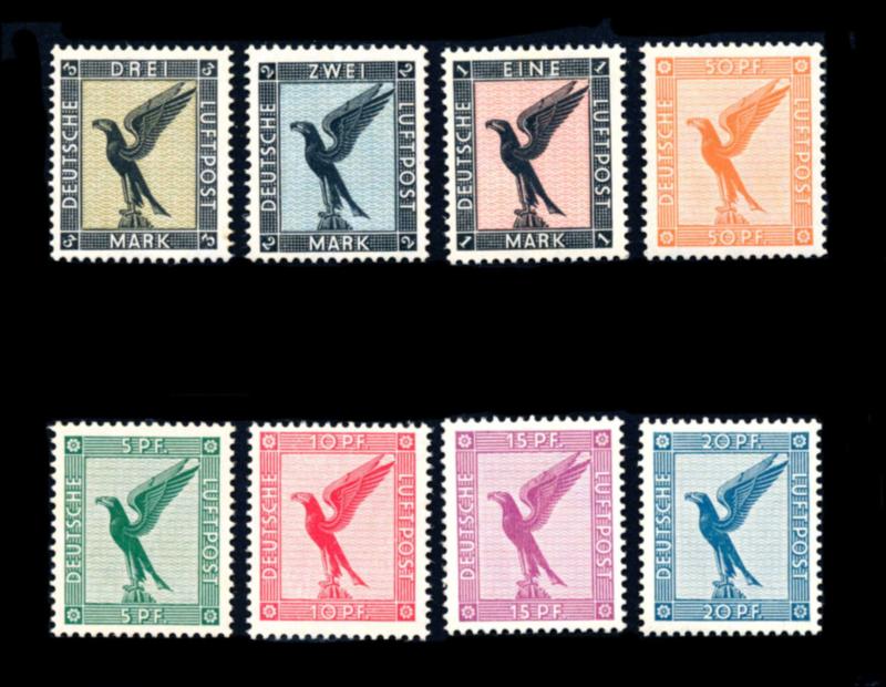 GERMANY 1926 SET #C27-C34 STAMPS VF **. German Eagle airmail set of 8 stamps mint never hinged. The stamps come with a 2010 Certificate from Austrian expert Peter Stastny. Scott $1250.00 CAD. (Image1)