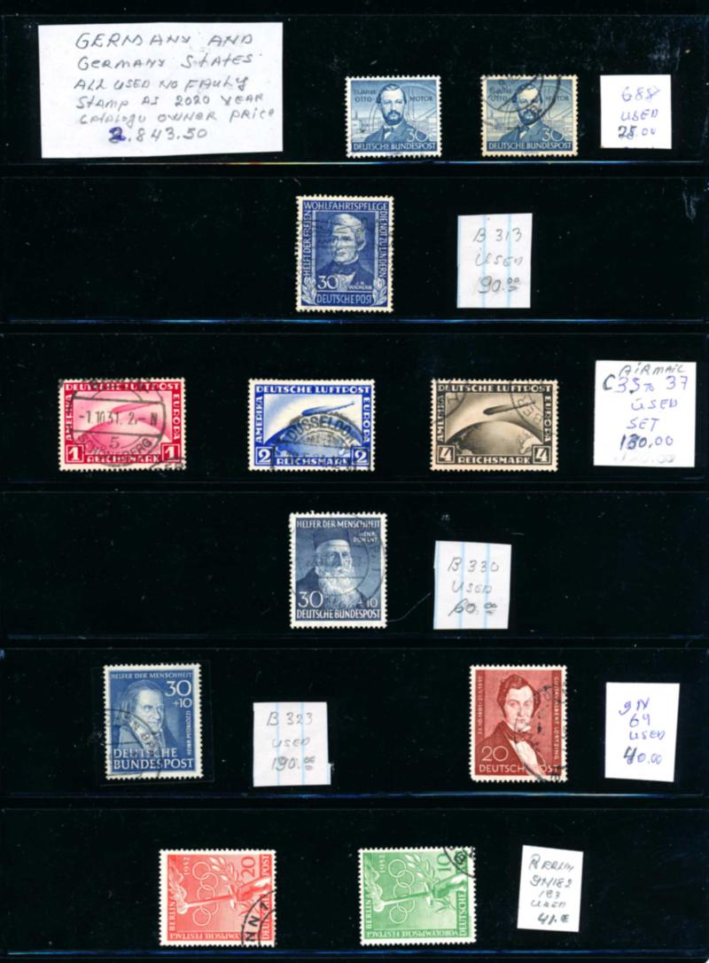 GERMANY LOT, STAMPS VG-VF /O. Selection of 108 used stamps. I noted Bavaria 46-47, 112, 271, 272, 274, B48-49, Germany #688, B24-26, B59-67, B313, B323, B330, C27-34, C35-37, C46-56, 9NB2-3 + some German States to be Checked. High catalog value. Starting bid $150.00. (Image1)