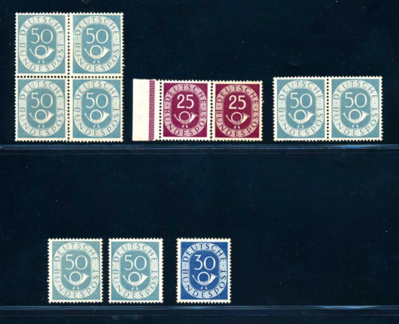 GERMANY 1951 SELECTION, STAMPS VF **. Posthorn issue, selection of 11 stamps mint never hinged. Numbers are: #678 pair, 679, 681 block of 4, pair and 2 singles. Scott $1470.00 CAD. (Image1)