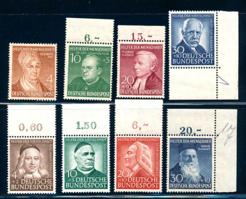 GERMANY 1952-53 SELECTION, 2 SETS VF **. Semi-postal issues, B327-30 + B334-37. The stamps are mint never hinged with top numbered margins except #B327 (right top corner with light glazed spot on gum) and B330 corner margin not numbered. Scott $240.00 CAD. (Image1)