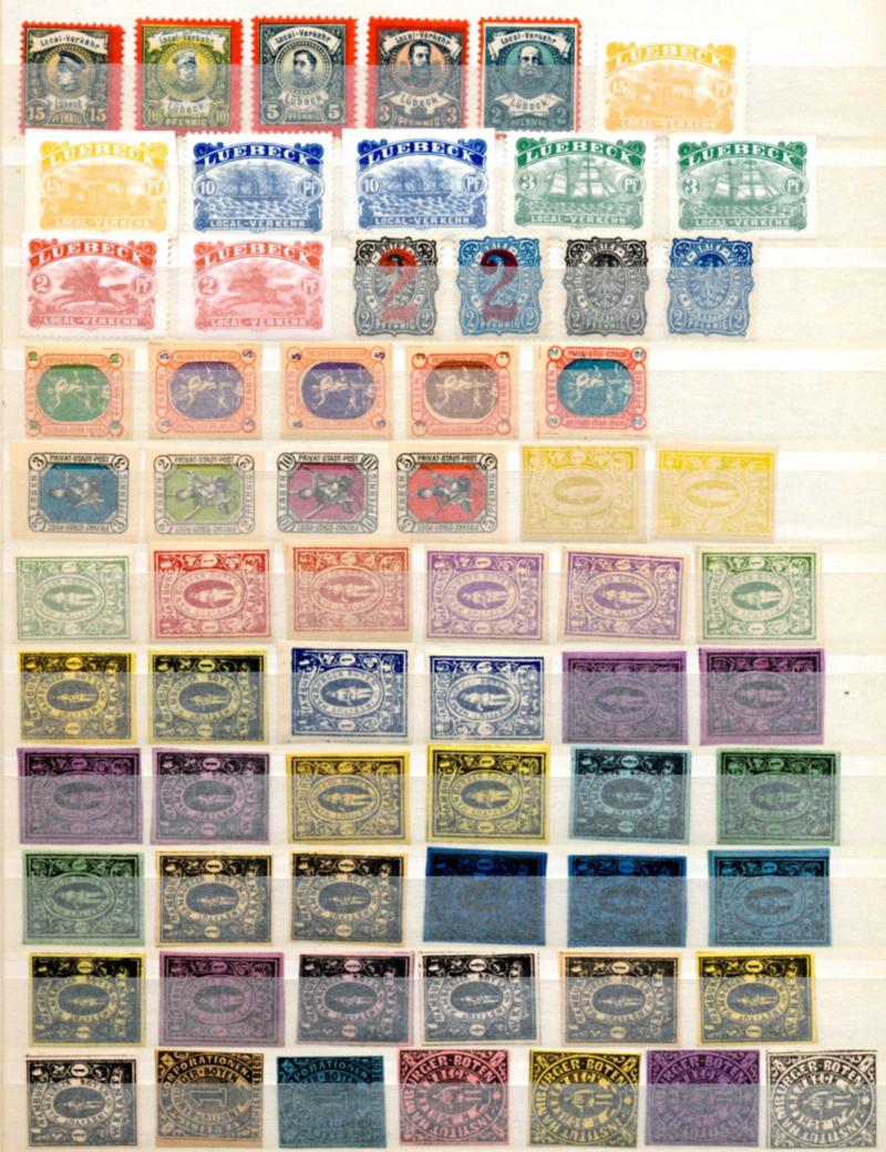 GERMANY, SELECTION LOCAL STAMPS F-VF */(*)/O. Stockbook containing a nice selection of local stamps from Bavaria,Essen, Hamburg, Lubeck, wurttemberg. The stamps are mint (284) and used (34). Interesting lot. Starting price $80.00. (Image1)