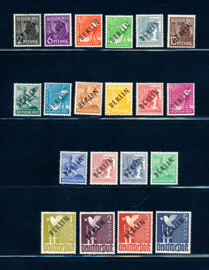 GERMANY BERLIN 1948 #9N1-N20 SET XF **. German stamps surcharged Berlin, for use in the American, British and French occupation sectors. Superb set of 20 stamps mint never hinged and all signed by German expert Schlegel on back. Scott $390.00 CAD. (Image1)