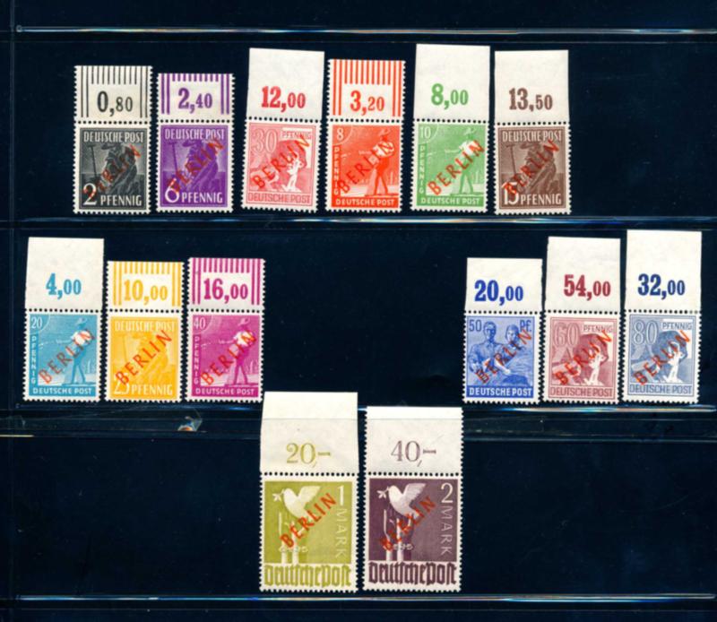 GERMANY BERLIN 1948-49 #9N21-34 SET XF **. Stamps of 1947-48 Germany overprinted in red, superb set of 14 stamps mint never hinged. This is a Showpiece set. 1994 certificate from German expert Schlegel. Scott $1470.00 CAD. (Image1)