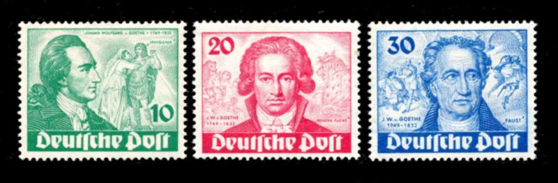 GERMANY BERLIN 1949 #9N61-63 SET XF **. Bicentenary of the birth of Johann Wolfgang von Goethe issue, Superb set of 3 stamps mint never hinged and signed Schlegel on back. Scott $340.00 CAD. (Image1)