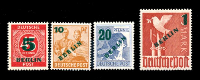 GERMANY BERLIN 1949 #9N64-67 SET XF **. German stamps surcharged Berlin, for use in the American, British and French occupation sectors. Superb set of 4 stamps mint never hinged and all signed by German expert Schlegel on back. Scott $270.00 CAD. (Image1)