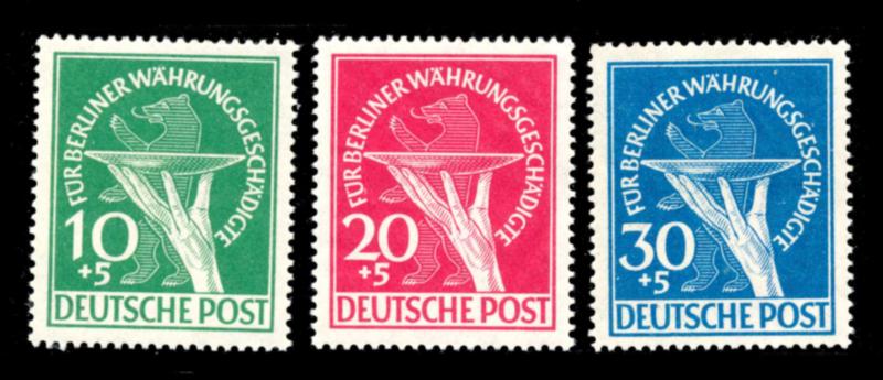 GERMANY BERLIN 1949 #9NB1-B3 SET XF **. Surtax for Berlin victims of currency devaluation, Superb set of 3 stamps mint never hinged. Scott $330.00 CAD. (Image1)