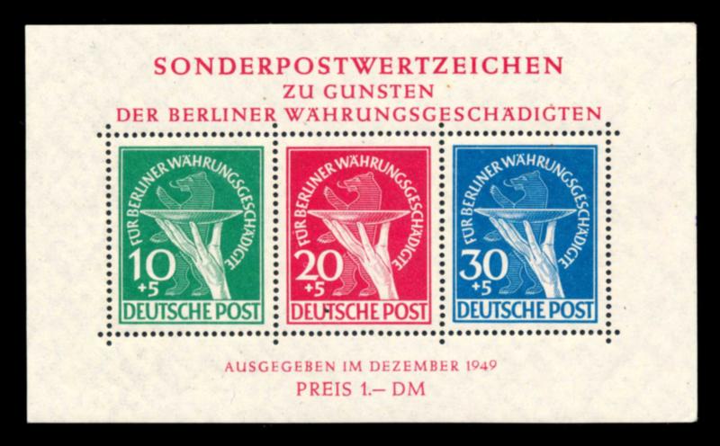 GERMANY BERLIN 1949 #9NB3a S/S XF **. Surtax for Berlin victims of currency devaluation, Superb souvenir sheet of 3 stamps mint never hinged. Scott $1360.00 CAD. (Image1)