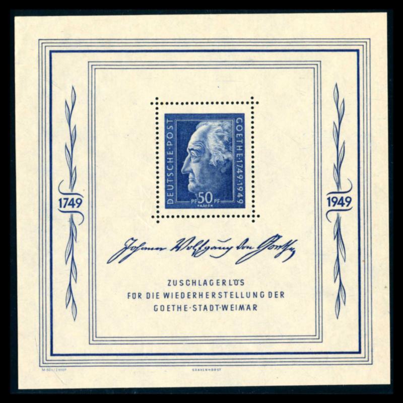 GERMANY D.D.R. 1949 #10NB11 S/S VF **. Russian Occupation Zones, Goethe souvenir sheet mint never hinged. Scott $200.00 CAD, Michel 220 Euros or $320.00 CAD. (Image1)