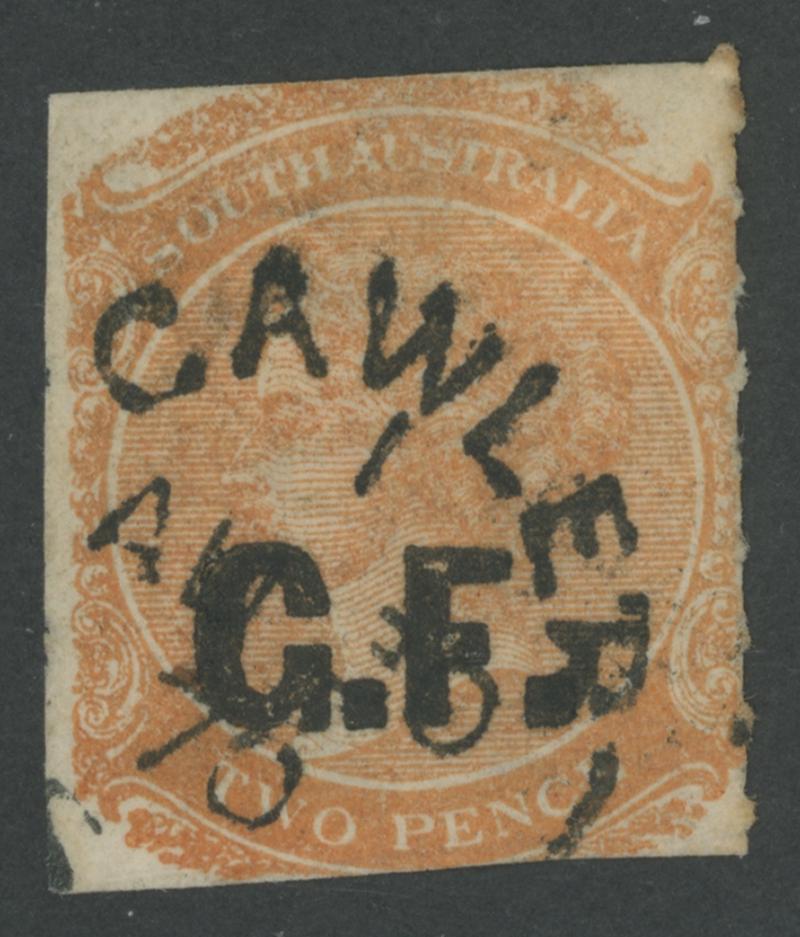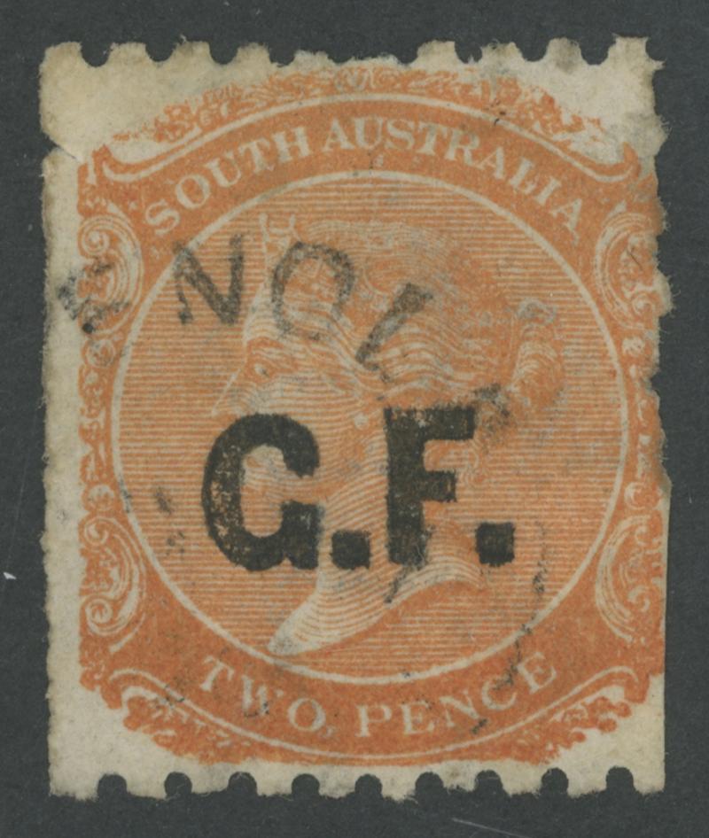 BLACK OVERPRINT: 'G.F.' on QV De La Rue Crown/SA Wmk Perf 10xRouletted 2d dull orange SG DO225, rouletting at right otherwise cut from the sheet to largely preserve the design, bold 'GAWLER/AU30/70/S.A' cds, Cat £2250. Rated RRRR: unrecorded unused. Ex 'Sir Humphrey' (Brian Farmer) - sold for $1207 (Sale 118 Lot 356) - and Rodney Attwood: sold for $1005 (Sale 198 Lot 2090). RPSV Certificate (2014). Don Pearce's fine example - full separations, small scissor-cut clear of the design - sold for $3355 (Sale 247 Lot 318). Absent from 'Besancon'. [Date range 20.8.1870 to 7.10.1870 only] (Image1)
