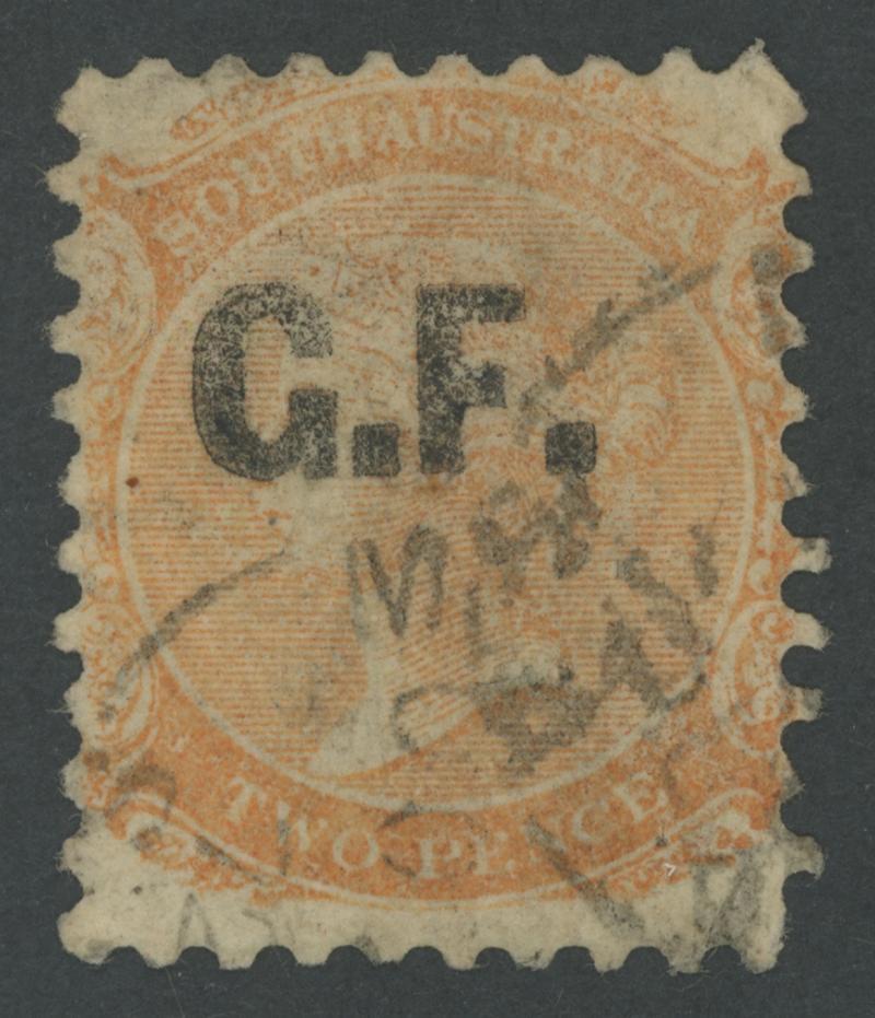 BLACK OVERPRINT: 'G.F.' on QV De La Rue Crown/SA Wmk Perf 10 2d pale orange SG DO226 with the Watermark Reversed, minor surface rubbing, light Moonta Mines (?) cds of 'OC-/72', Cat £1750+. Rated RRRR: unrecorded unused. Ex Victor Bullock: sold for $2795 (Sale 130 Lot 448). RPSV Certificate (2007). More attractive than Don Pearce's example with normal watermark that sold for $2155 (Sale 247 Lot 320). Absent from 'Besancon'. [Date range -.10.1872 to 1.6.1874] (Image1)