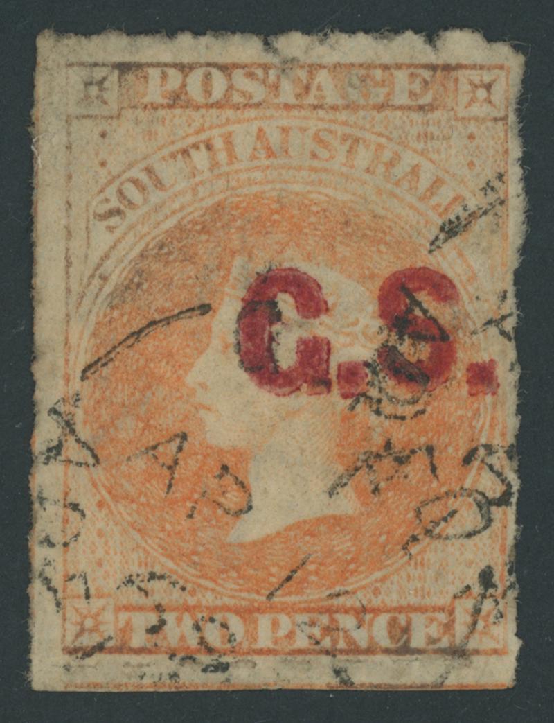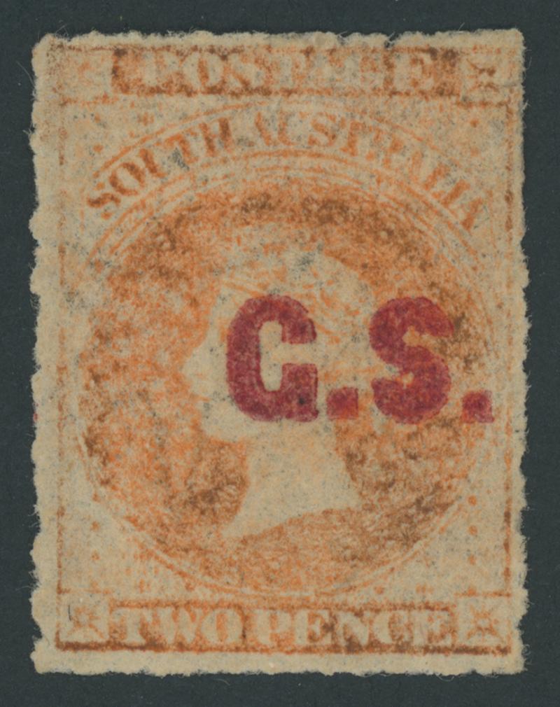 RED OVERPRINT: 'G.S.' on QV Perkins Bacon Large Star Wmk Rouletted 2d bright vermilion SG DO248, rouletting on all sides but cut from the sheet at base to preserve the design, light GPO cds of 'AP12/69', Cat £1000. Rated RRRR. Don Pearce's example - small separation fault at upper-left, also dated 'AP12/69' - sold for $1435 (Sale 247 Lot 374). The two stamps were formerly a pair, of which this was the left-hand unit.