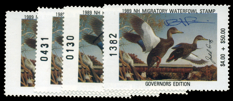 NH7G,G(s),G(c),G(as),NEW HAMPSHIRE 1989 GOVERNOR'S EDITION, SET OF (4), includes mint stamp, stamp signed by Gov. Judd Gregg, stamp signed by artist Robert Steiner and a contingency stamp with no serial no., VF NH Cat($675) (Image)