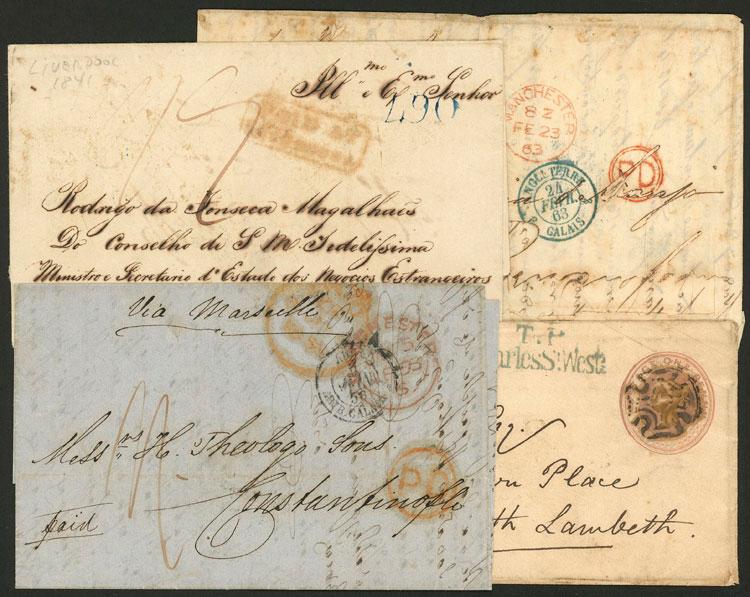 1841 to 1863, 3 folded covers or entire letters + 1 postal stationery (envelope) sent to various destinations, very attractive postal marks, low start! IMPORTANT: Please view ALL the photos of the lot, because all the material has been scanned. (Image)