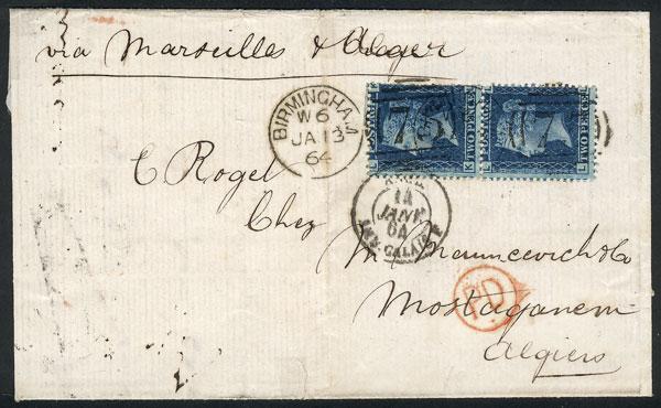13/JA/1864 Birmingham - Mostaganem (Algeria): Cover franked with vertical pair SG.45 (2p. blue plate 9), with duplex cancels "Birmingham 75", red "PD", and several transit marks on front and back, very nice and unusual destination! (Image)