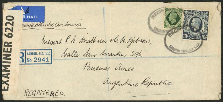 Registered airmail cover sent from London to Argentina in 1941 with attractive postage and censorship, on back arrival mark of B.Aires, very nice! (Image)