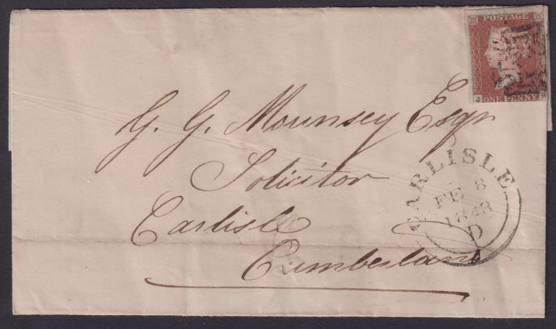 1841 1d red-brown (JB), imperf 2½+ margins, tied by black MC, with black NEWPORTMON/FE 7/ 1843 b/s & CARLISLE/FE 8/1843 arrival cds on folded entire. SG cat £60 on cover. (Image)
