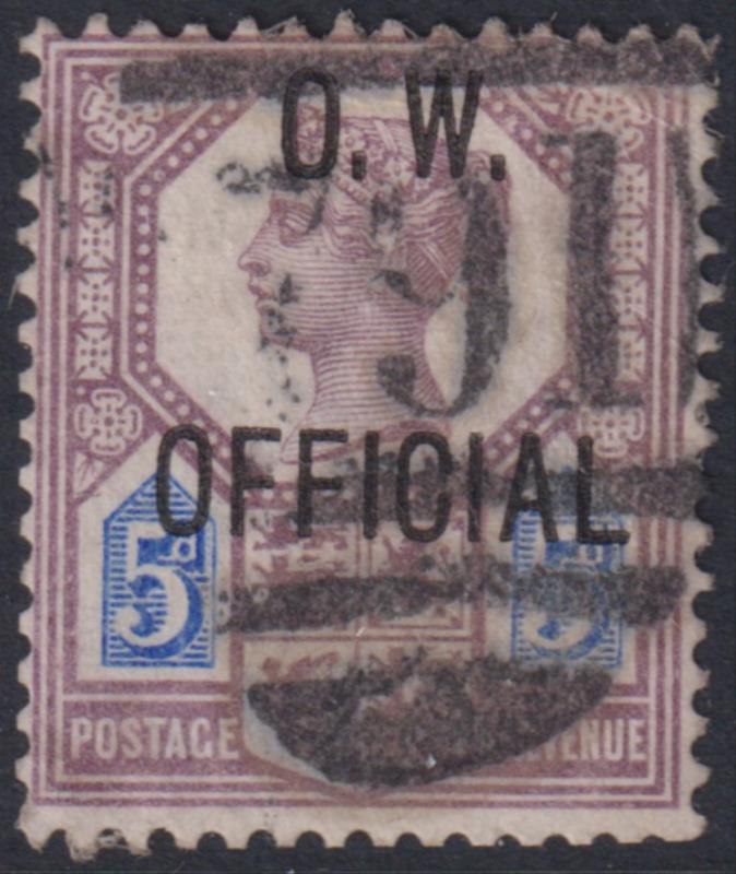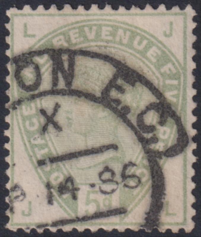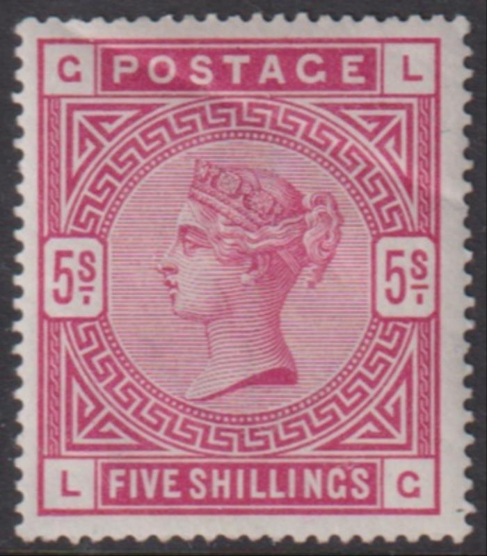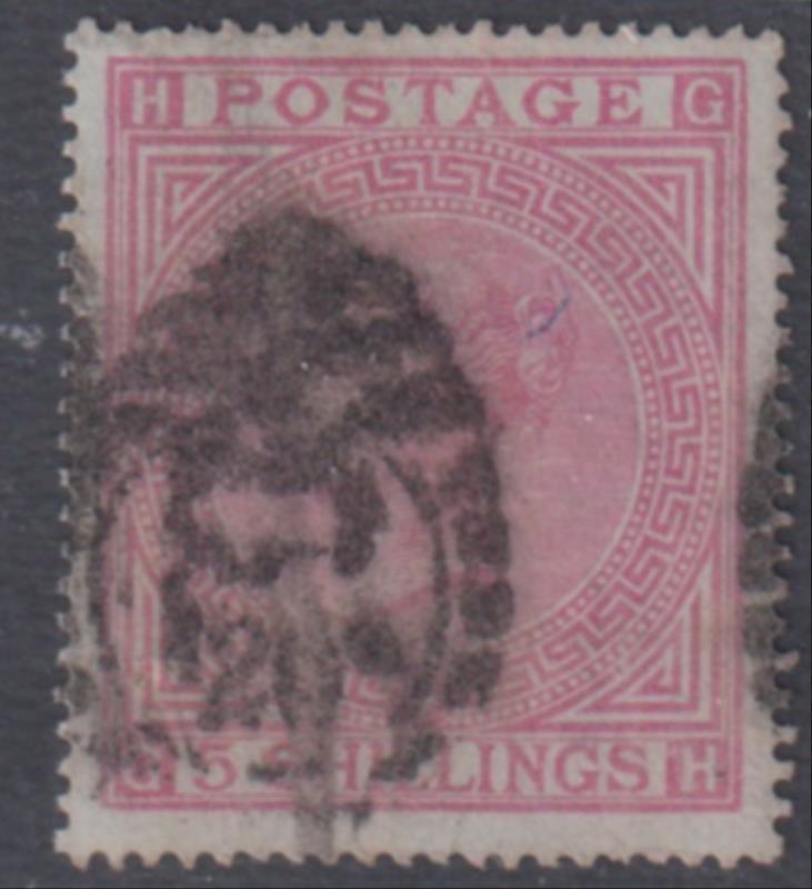 1882 5/- rose, blued paper, large uncoloured letters, anchor wmk. Heavy pmk. SG 130. Cat £3500. Used. (Image)
