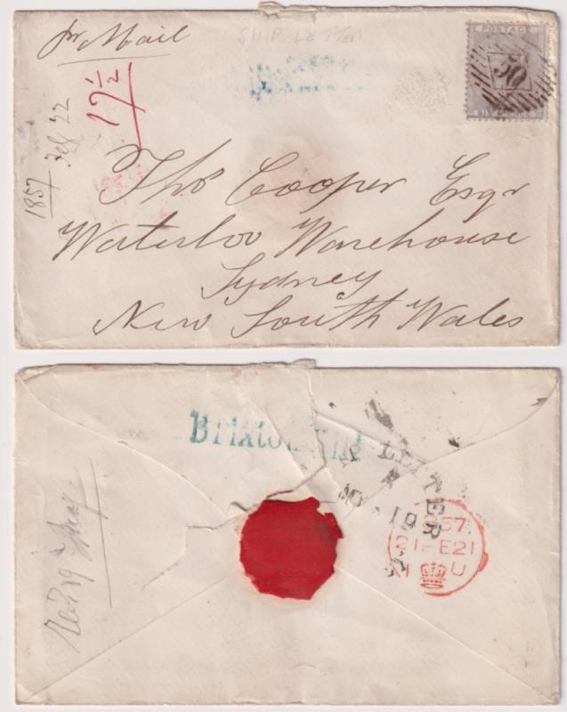 1857 cover to Sydney, NSW, franked 1856 6d pale lilac on azure paper (no corner letters), GU/FU, canc 50" diamond in bars obliterator. Red m/s endorsement "17½"(?) B/s "Brixton End" straight-line h/s (blue), London red cds (with crown) 21 FE, 4 partial "[SH]IP LETTER / [SYDNEY]" unframed semi-circular d/s MY 19. Flap tear, otherwise fine. SG 70a. Cat approx £1900 on cover. (Image)