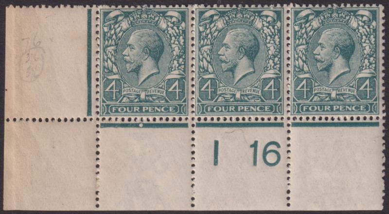 1916 4d GV grey-green horiz control strip of 3 "I16", with both selvedges perforated through. Selvedge slightly discoloured at left & mounted, stamps are MUH. SG 379. cat £75 as stamps. (Image)