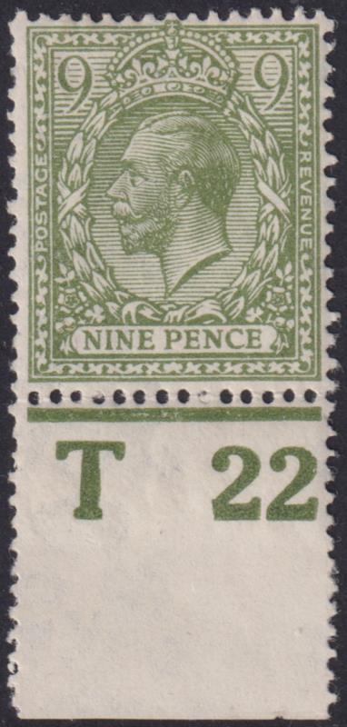 1917 1/- GV bistre-brown horiz control strip of 3, "J17", both selvedges perforated through. SG 396. Cat £165 as stamps. Selvedge mounted, stamps MUH. (Image)