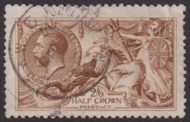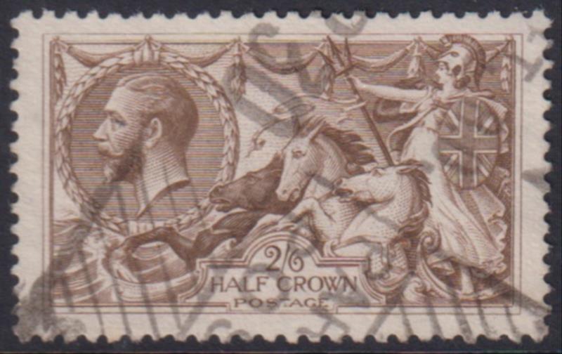 1918 2/6d GV Seahorses chocolate brown, BW printing, quite reasonable parcel pmk. SG 414. Cat £75. GU. (Image)
