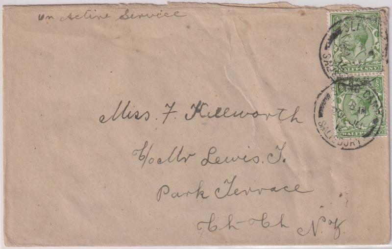 1916 WWI "SLING CAMP/SALISBURY" good/fine complete cds 20 JU 16 on GV ½d vert pair on OAS cover to Christchurch, NZ. Probably from a NZ soldier at the camp. Good condition. (Image)