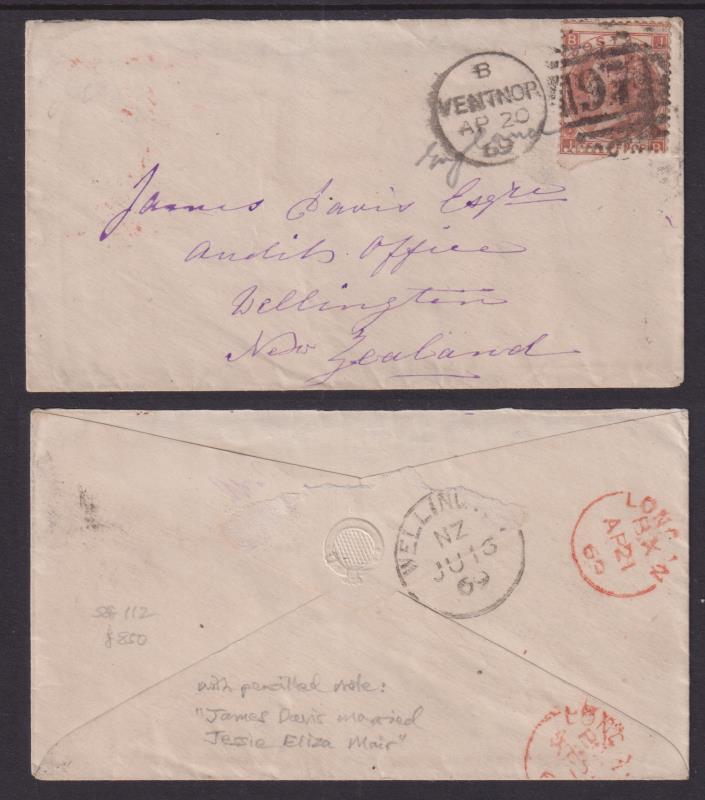 1869 neat cover to NZ, franked 1867 10d QV red-brown SG 112 (GU only), canc Ventnor duplex d/s AP 20 69, b/s London transit cds AP 21 69 & Wellington receipt cds JU 16 69. Flap missing. SG 112, cat £850 on cover. (Image)