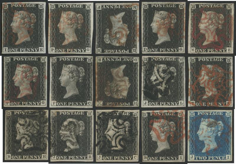 1840 'Penny Black' selection comprising Plate 1b [I-E] & [P-G] both with constant varieties and [M-F] with the Watermark Inverted; Plate 2 [D-G] with 'D' Doubled and [M-E] with 'M' Doubled and superb Maltese Cross stated to be in "ruby" ink; Plate 4 [F-G] and unused [P-G]; Plate 6 [D-B] with the Watermark Inverted, [J-L] stated to be cancelled with Maltese Cross of Warwick in black and [T-E]; Plate 8 [B-H], [J-B] & [J-C] with 'Original Re-Entry'; and Plate 9 [B-I]; plus "Tuppence Blue" Plate 1 in a deep shade; a few minor blemishes but all with full margins and generally fine to very fine, Cat £32,000+. A very attractive group of the World's First Postage Stamps. (Image1)