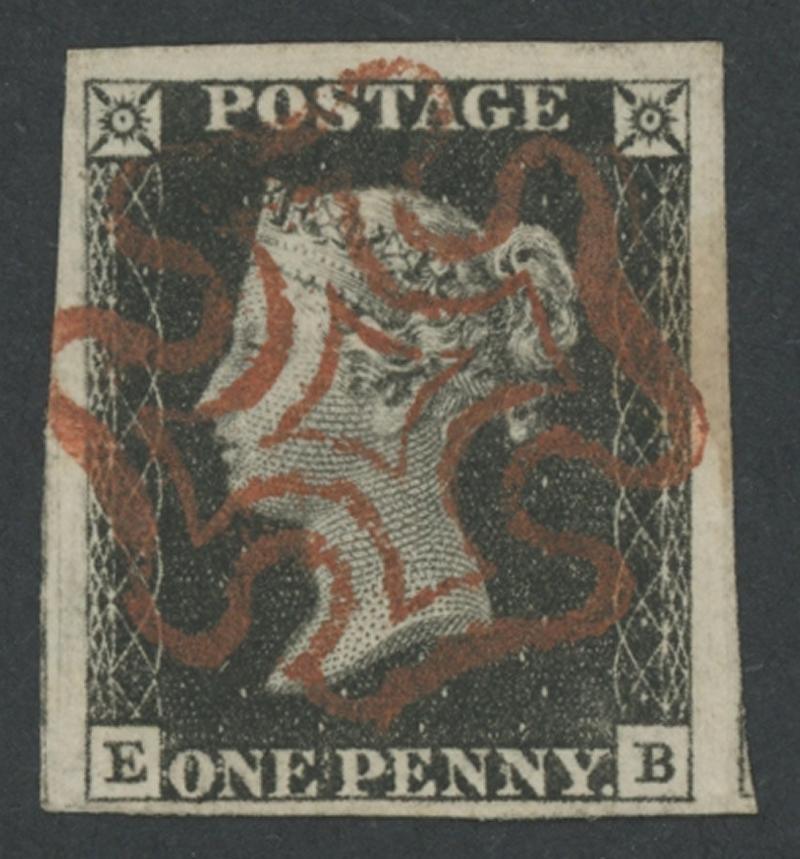 1840 Penny Black 1d black SG 2 [E-B] stated to be from Plate 1b, three huge margins & close at base with fragments of two adjoining units, superb Maltese Cross cancel in red, Cat £375. (Image1)