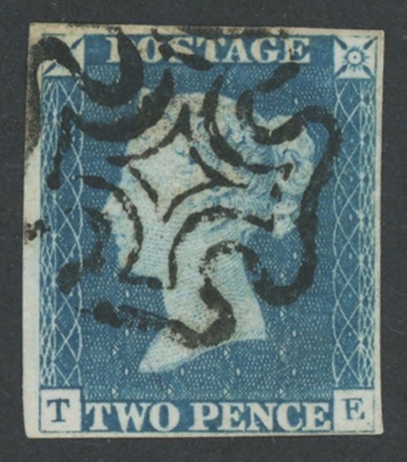 1840 Tuppence Blue 2d blue SG 5 [T-E], margins just clear to good, neat Maltese Cross in black, Cat £975. (Image1)